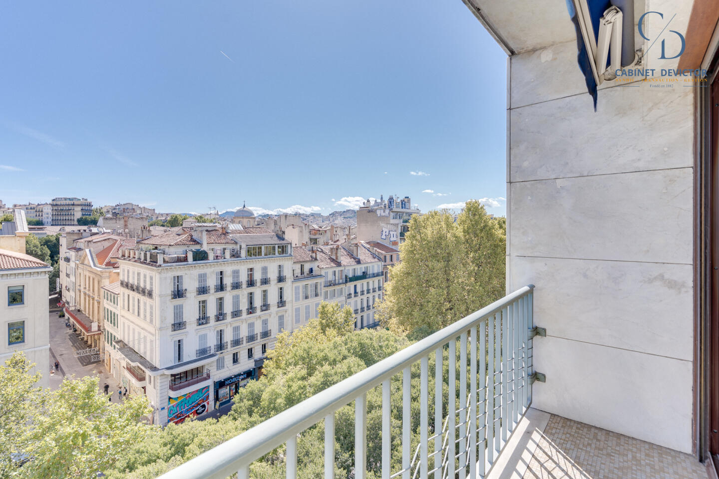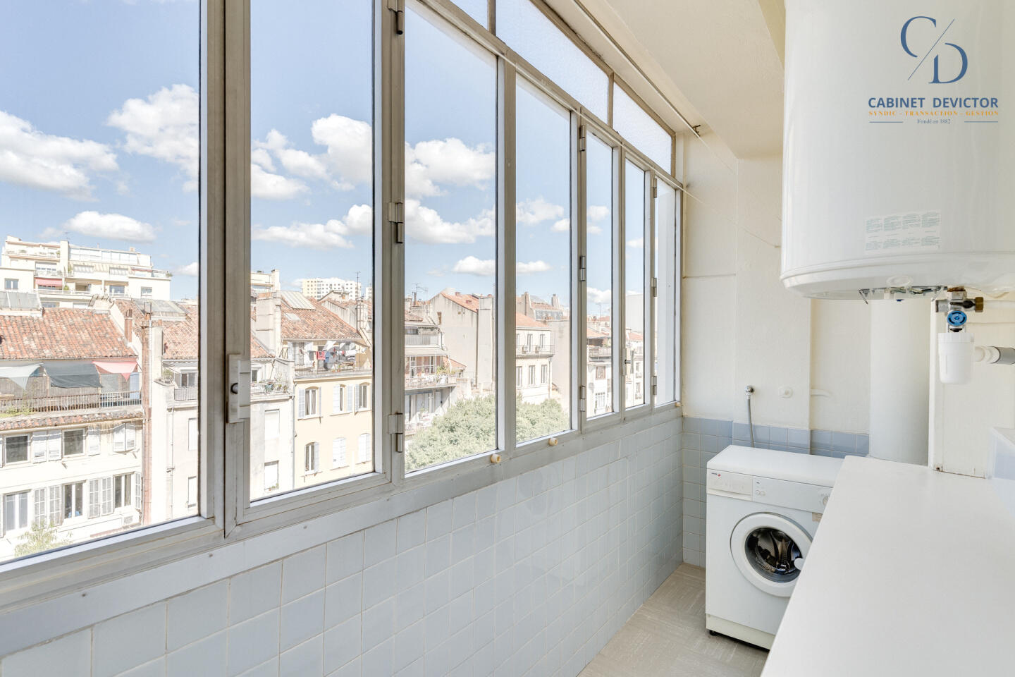 Une cuisine indépendante avec sa loggia fermée, deux chambres, une salle de bain, un wc séparé, ainsi qu'une pièce de vie donnant sur trois balcons (assez large pour recevoir une table et deux chaises) avec une vue dégagée sur les toits Marseillais.