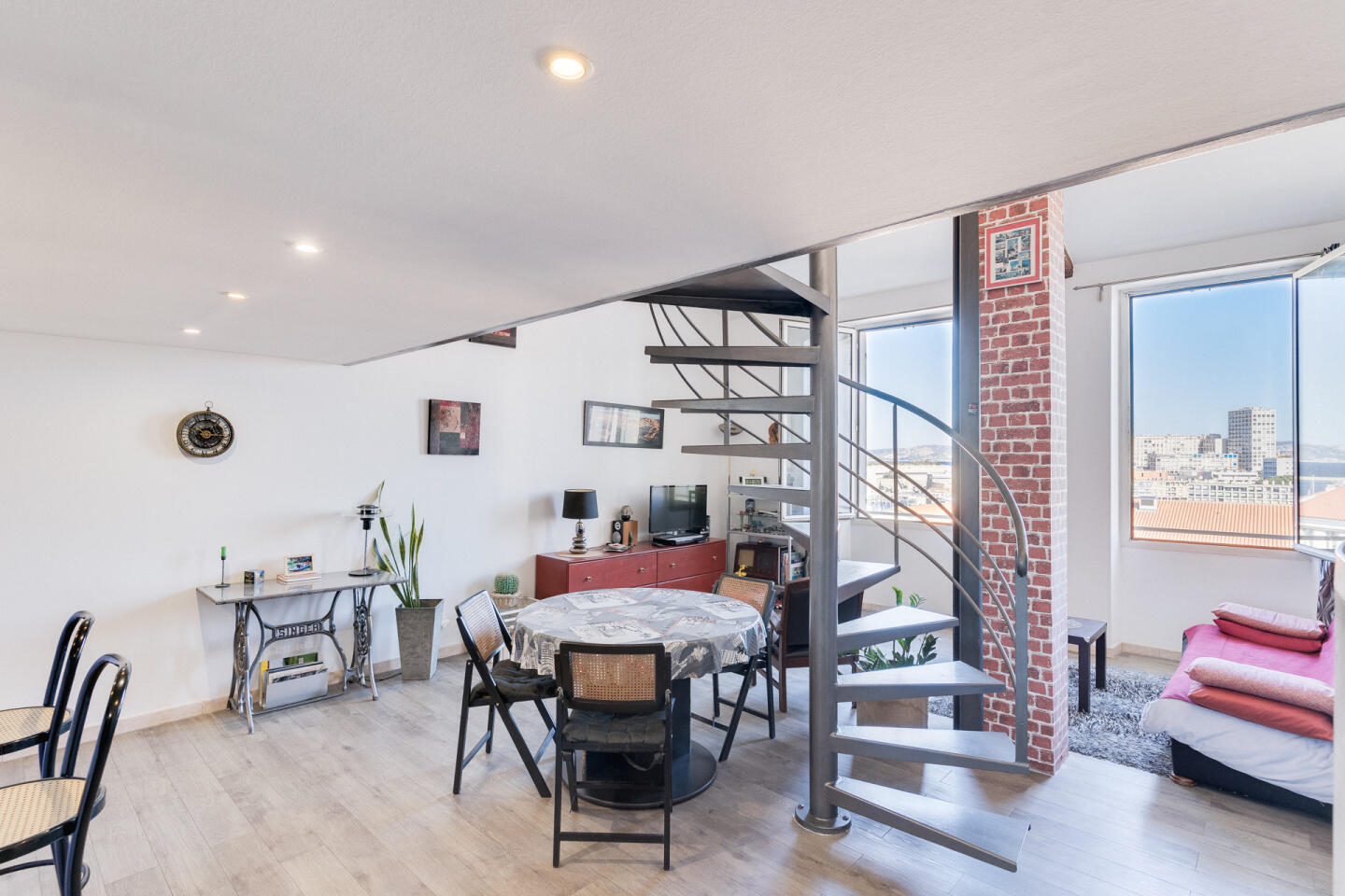 Le premier est un duplex de 58m² , pièce de vie avec sa cuisine attenante, ainsi qu'une chambre avec salle d'eau à l'étage, très belle hauteur sous plafond, le tout donnant sur une agréable Vue Mer.