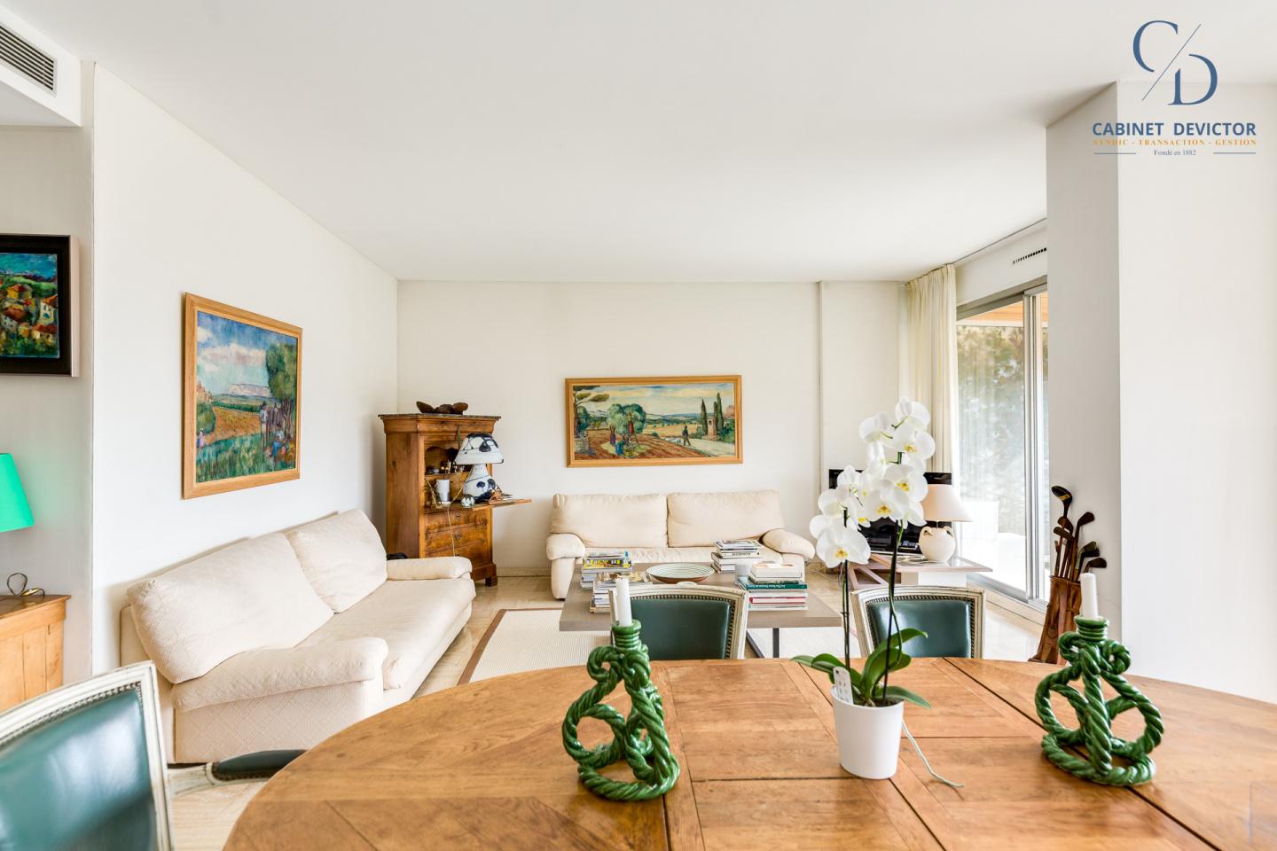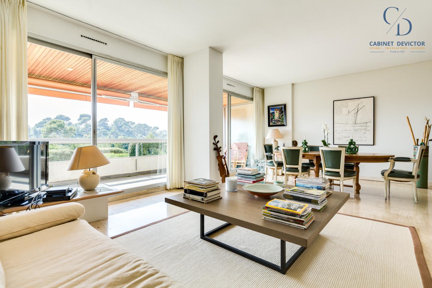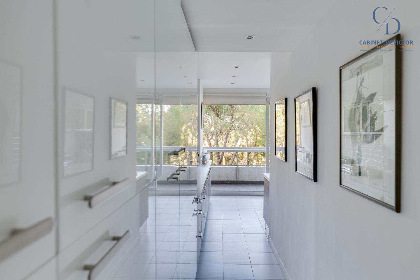 Un vaste double séjour s'ouvre sur une grande terrasse exposée sud avec une superbe vue sur la mer. La belle cuisine, quant à elle, dispose d’une seconde terrasse offrant une vue sur le parc de la résidence.