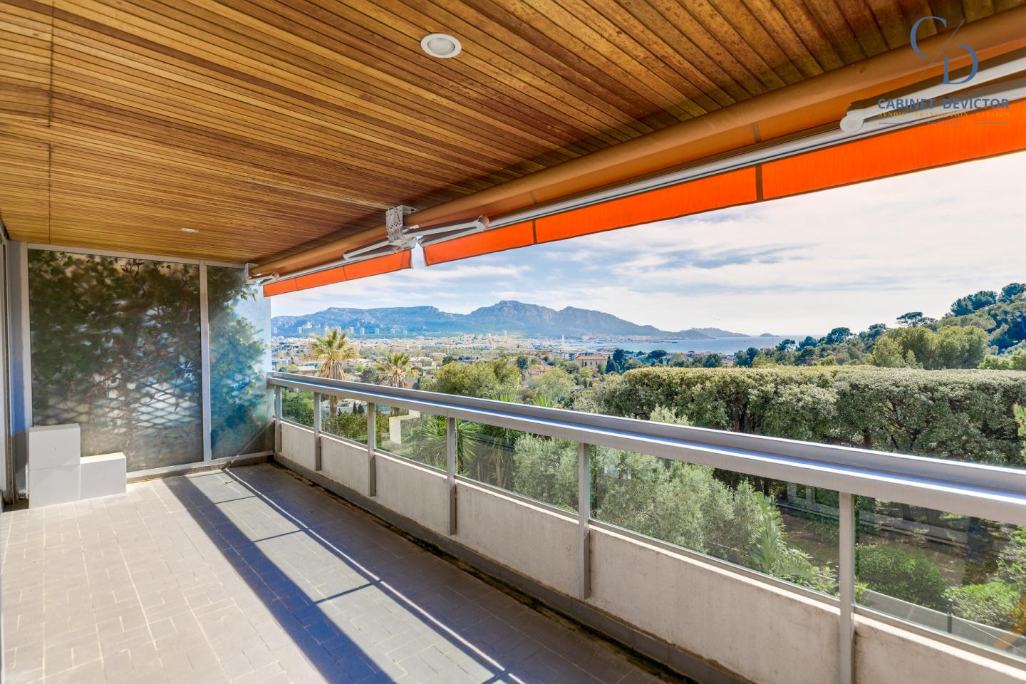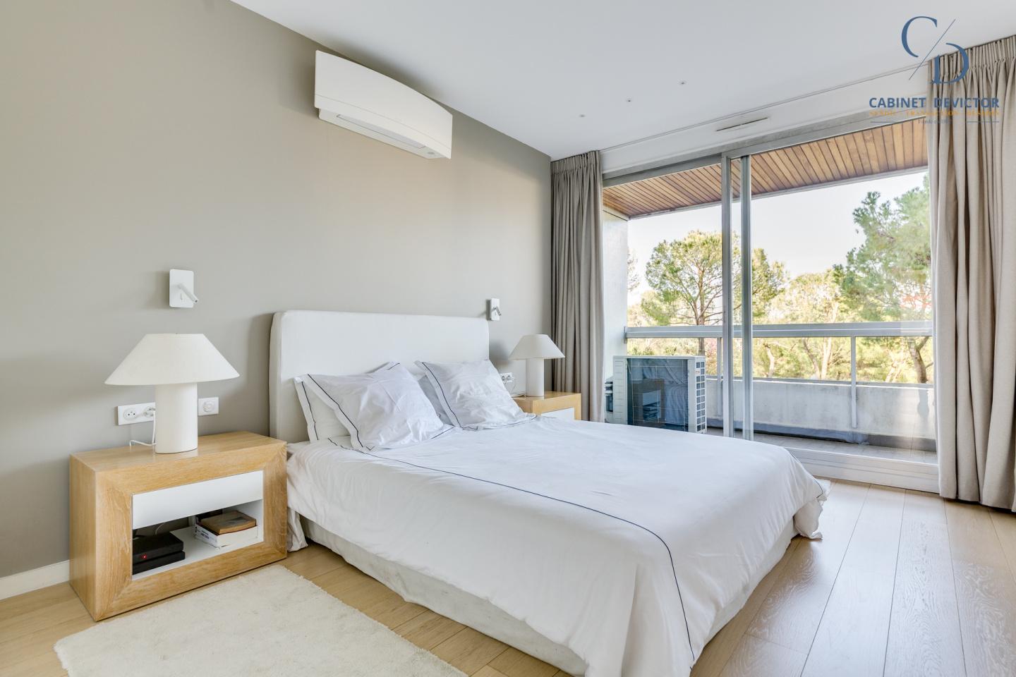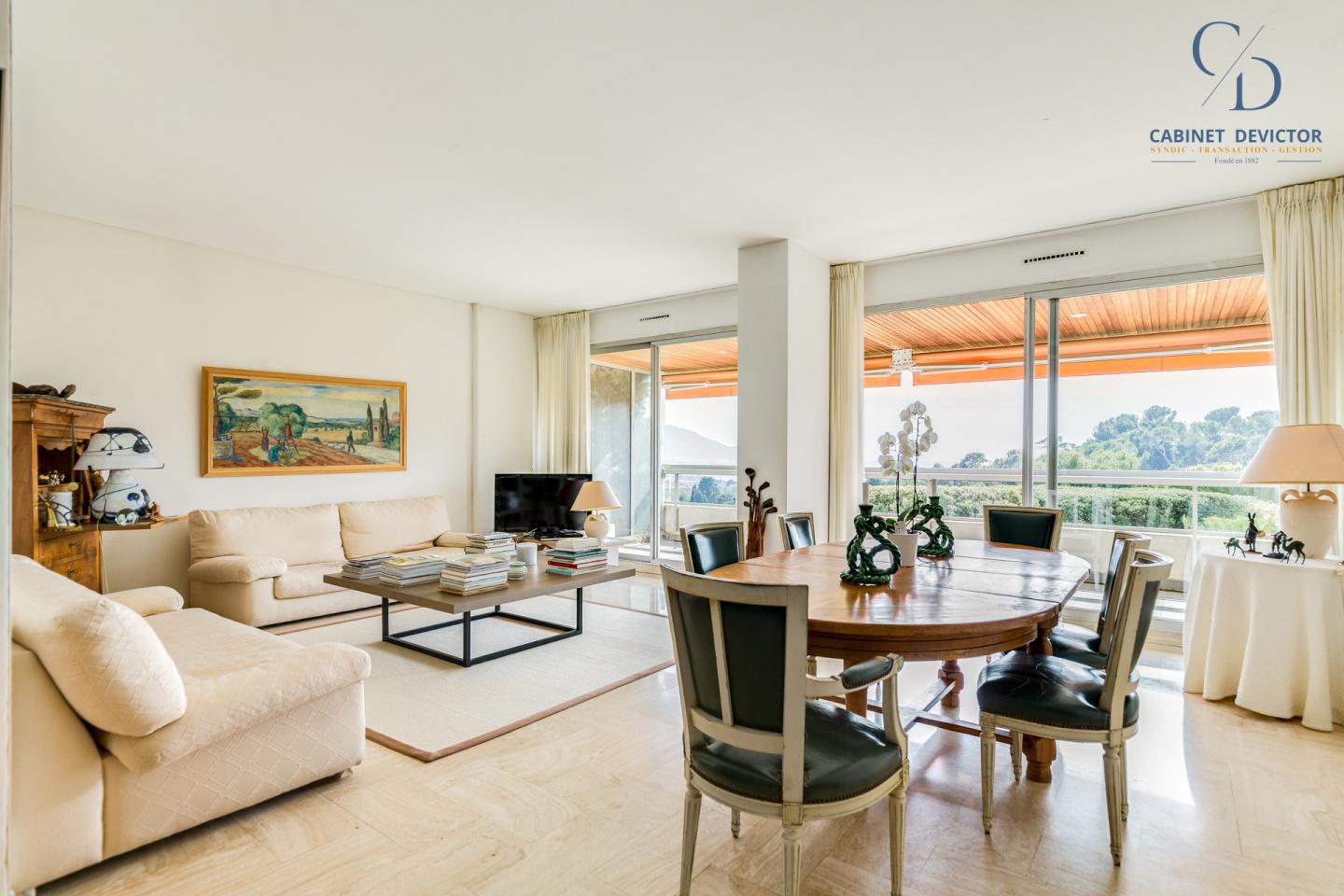 Un vaste double séjour s'ouvre sur une grande terrasse exposée sud avec une superbe vue sur la mer. La belle cuisine, quant à elle, dispose d’une seconde terrasse offrant une vue sur le parc de la résidence.