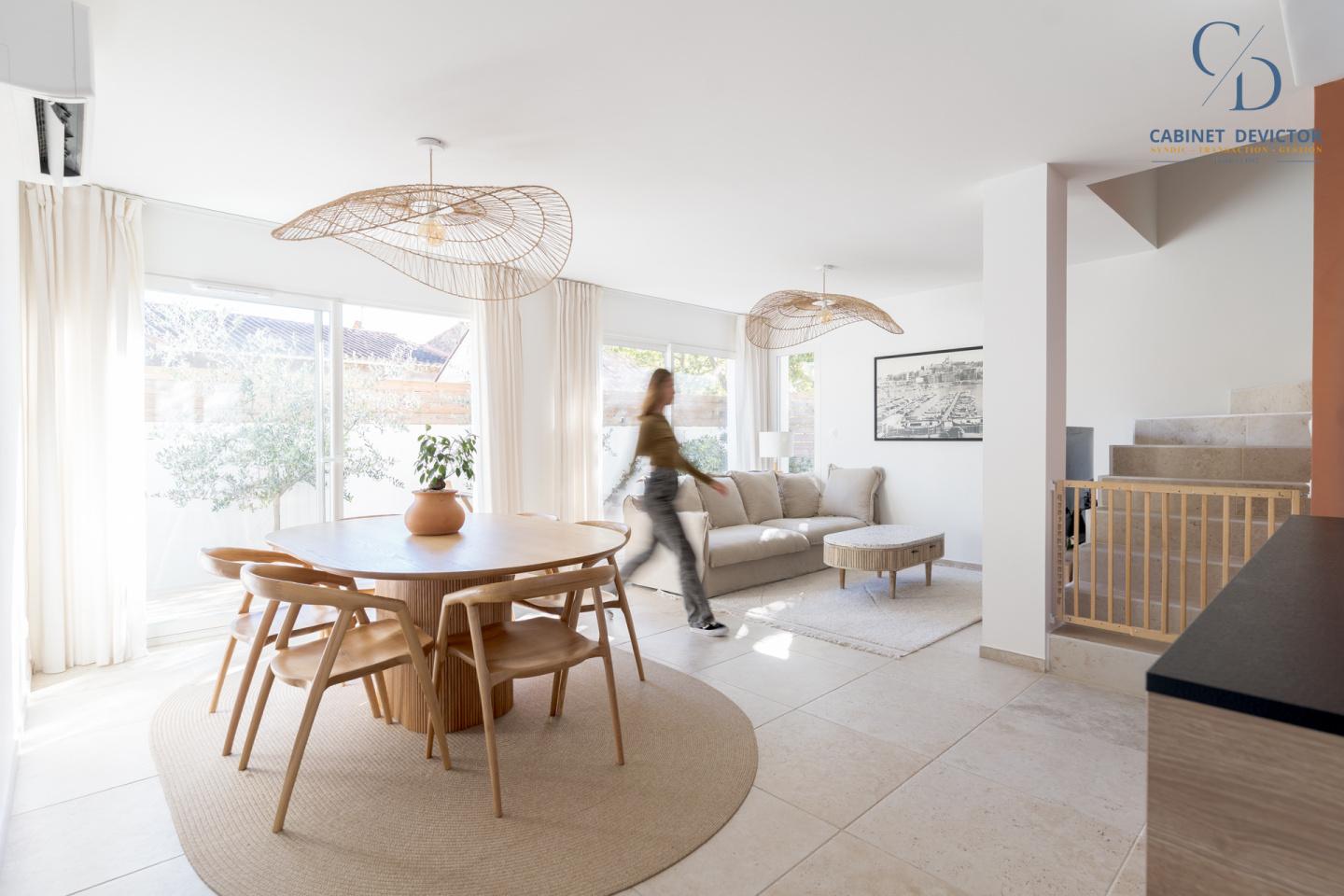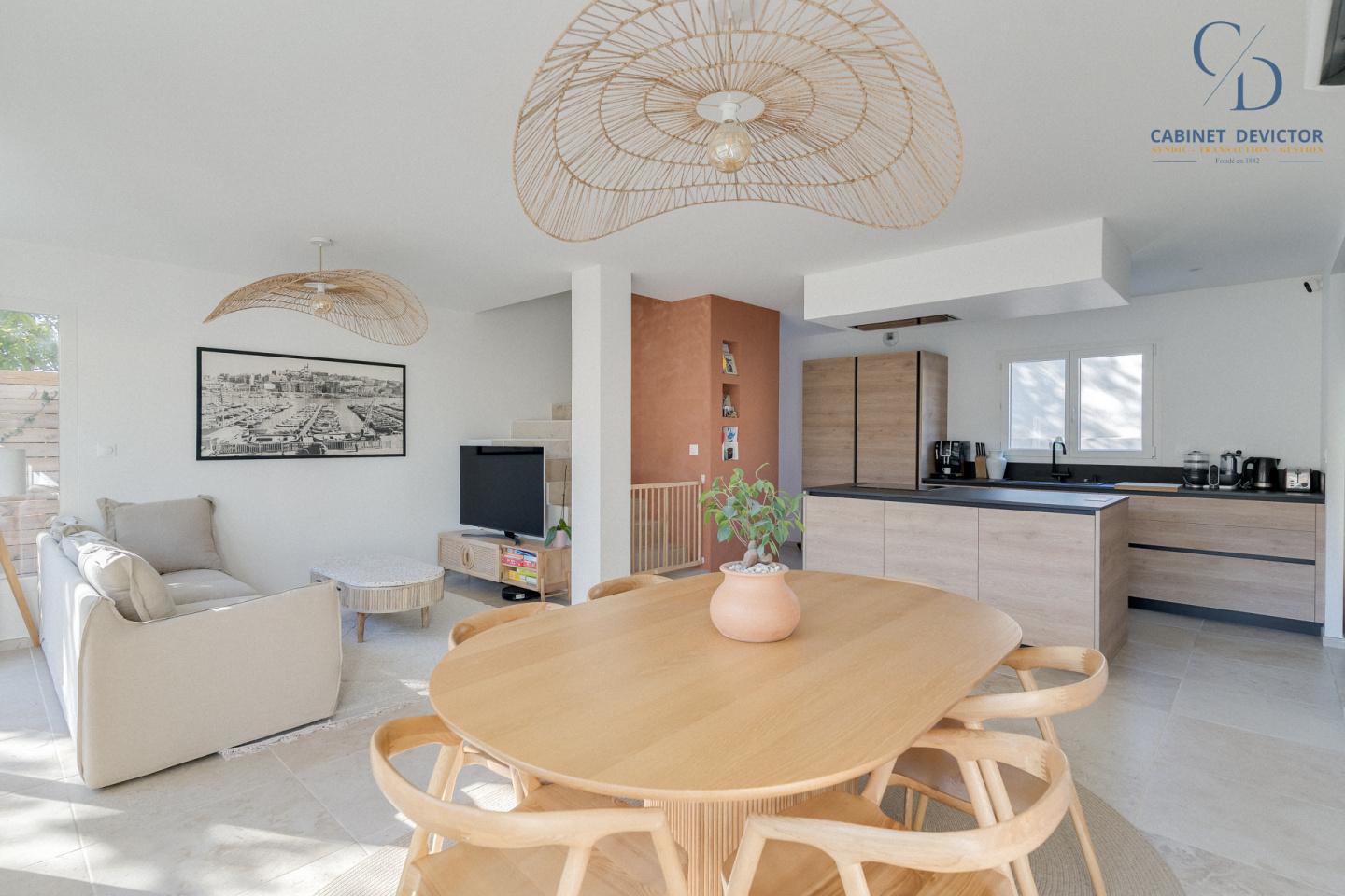 Le Rdc se compose d'une pièce de vie avec cuisine entièrement équipée, un espace salon et salle à manger donnant sur une terrasse ensoleillée.